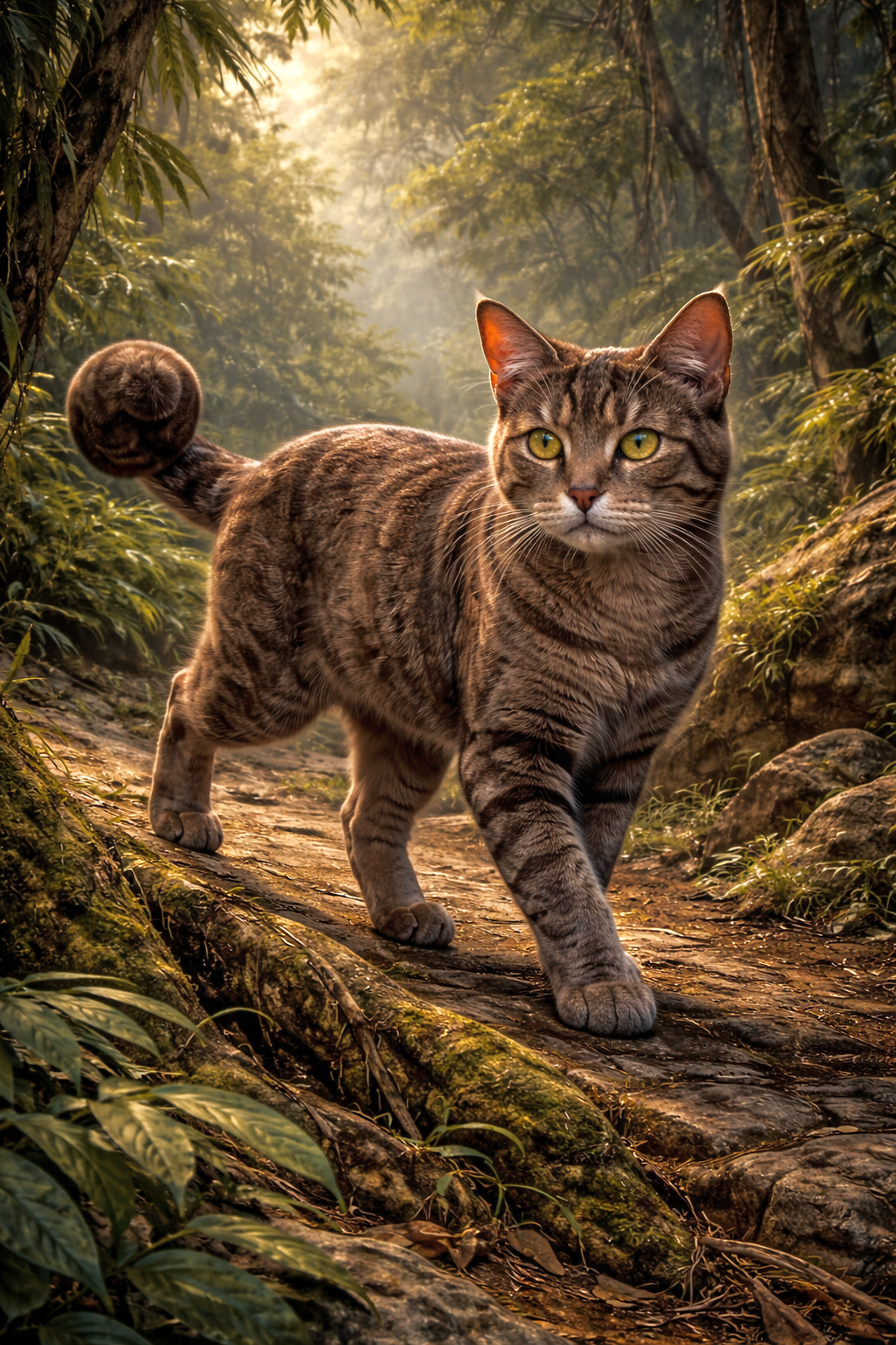 Die Bewegungen dieser Katzenart gelten als gleichmäßig und kontrolliert, was die Vorstellung unterstützt, dass sie sich sicher in schwer einsehbaren Landschaftszonen bewegen kann. Das Fell wird meist in natürlichen, leicht schattierten Tönen beschrieben, die sich harmonisch in die gedämpfte Farbwelt dichter Wälder einfügen.