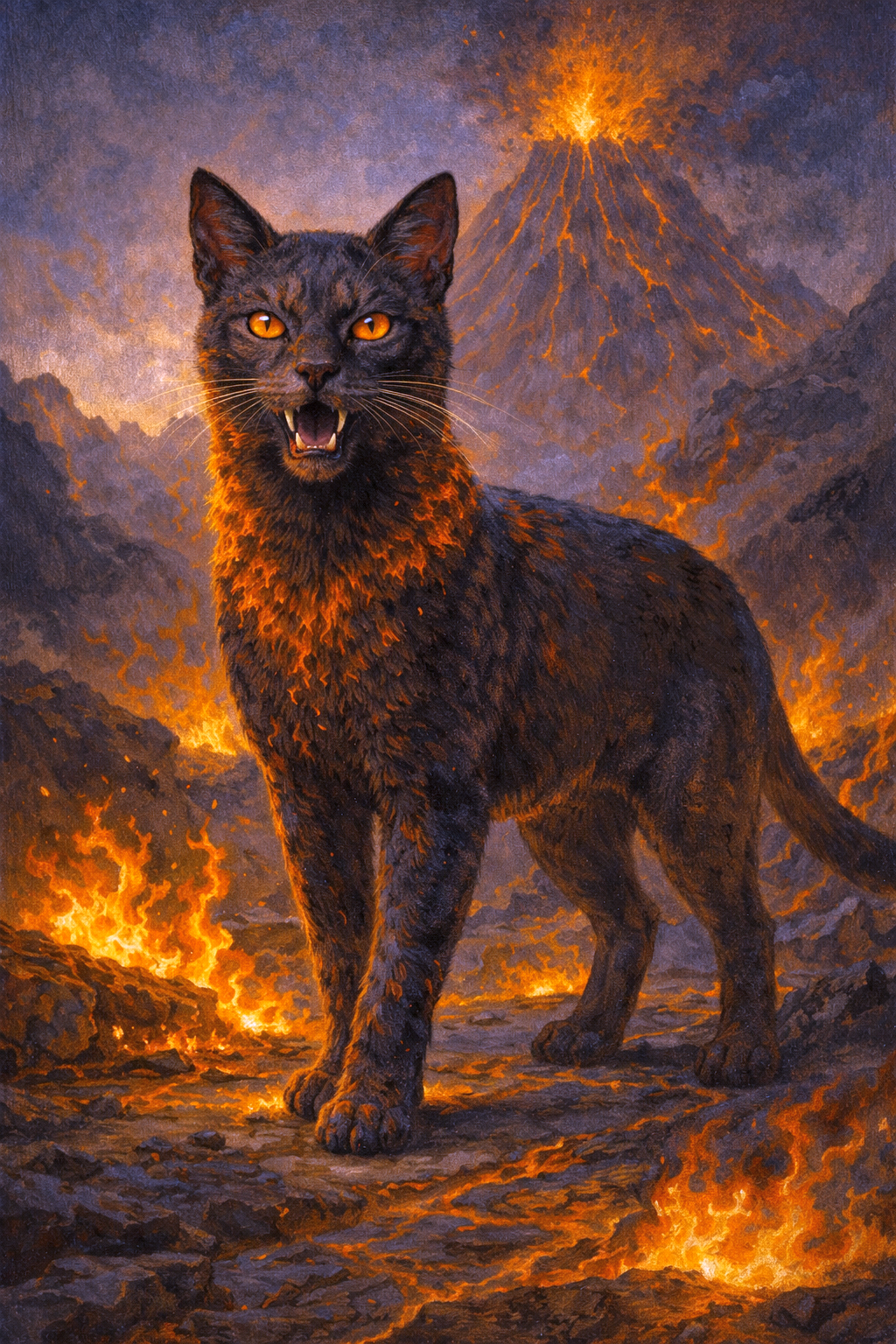 Die Hellfire Cat ist eine selten überlieferte mythologische Katze, deren Ursprung in den vulkanisch geprägten Regionen Südeuropas verortet wird, wo sie als stiller Wächter thermischer Übergangszonen galt und mit natürlichen Feuerlinien in Verbindung gebracht wurde. In alten Chroniken erscheint sie nicht als aggressives Wesen, sondern als ruhige Präsenz in Landschaften, die von Hitze, Asche und mineralischem Gestein geprägt waren. Ihr dunkles Fell mit rötlich schimmernden Spitzen wurde als Spiegelung unterirdischer Glut interpretiert, während die kupferfarbenen Augen als Zeichen innerer Wachsamkeit galten. Zeitgenössische Beschreibungen berichten von ihrem Aufenthalt nahe warmer Felsformationen und dampfender Erdspalten, wo sie reglos verweilte und scheinbar Veränderungen der Umgebung wahrnahm. Die Hellfire Cat wurde nicht als Verkörperung von Zerstörung verstanden, sondern als Symbol kontrollierter Kraft und natürlicher Erneuerung. Man schrieb ihr die Fähigkeit zu, Spannungen im Boden und im Klima frühzeitig zu spüren, weshalb ihre Anwesenheit als Hinweis auf bevorstehende geologische Aktivität gedeutet wurde. In religiösen Randüberlieferungen wurde sie mit innerer Läuterung und dem Durchschreiten schwieriger Phasen verbunden. Ihr Wesen galt als zurückhaltend, konzentriert und von stiller Stärke geprägt. Bewegungen wurden als langsam und bewusst beschrieben, als folge jede Handlung einem inneren Rhythmus der Erde. In Darstellungen erscheint sie häufig am Rand erhitzter Steinflächen oder in der Nähe dunkler Lavagesteine, ohne das Zentrum der Szene einzunehmen. Anders als andere feuersymbolische Gestalten wurde sie nicht mit Chaos assoziiert, sondern mit Ausgleich und kontrollierter Wandlung. Ihre mythologische Rolle liegt im Begleiten natürlicher Übergänge, im Bewahren innerer Stabilität unter extremen Bedingungen und im ruhigen Beobachten von Prozessen, die sich dem menschlichen Zugriff entziehen. Innerhalb der europäischen Feuerüberlieferungen nimmt die Hellfire Cat damit eine besondere Stellung ein, da sie weniger als dramatische Erscheinung gilt, sondern als Sinnbild von Beständigkeit, Erdverbundenheit und stiller Präsenz im Wandel der Elemente.
